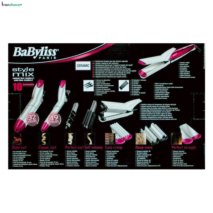 حالت دهنده مو بابیلیس ده کاره دارای مجموعه ای از ۱۰ حالت دهنده های مخنلف است.دارای صفحات فر،صاف کننده،چین دار،ویور،مار پیچ،سنجاق مو میباشد.