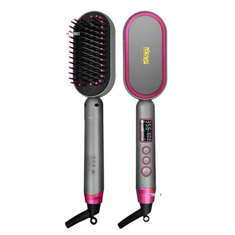برس حرارتی دی اس پی dsp-10248 با بدنه طوسی و صورتی رنگ و طراحی شکیل و بی نظیری که دارد در همان نگاه اول کاربر را جذب خود می کند. بدنه برس حرارتی بسیار محکم و مقاوم است که نشان دهنده کیفیت بالای ساخت این محصول می باشد. اندازه سیم 2 متر است که این سیم بلند و باکیفیت استفاده از دستگاه را در هر مکانی راحت کرده است. چرخش 360 درجه سیم از خرابی و فرسودگی آن در طول سال ها استفاده پیشگیری می کند. پایین بدنه به یک حلقه آویز مجهز شده است. مواقعی که از برس حرارتی استفاده نمی کنید، می توانید سشوار را از طریق حلقه آویزان کنید. وزن دستگاه نرمال است و هنگام کار با آن دست تان احساس خستگی و درد نخواهد کرد. برس حرارتی دی اس پی 10248 ابزاری کاربردی و مفید است که با داغ شدن دندانه ها همزمان عمل خشک کردن، برس کشیدن و صاف کردن موها را انجام می دهد. یعنی برس حرارتی می تواند به تنهایی هم کار سشوار و هم اتو مو را بکند و در نهایت موهایی صاف، خوش حالت و درخشان را برایتان به ارمغان بیاورد. این براس حرارتی شبیه برس مو معمولی است. اما با این تفاوت که برقی است، قابلیت تنظیم دما دارد و دندانه های آن داغ می شوند. جنس دندانه های برس حرارتی از ترکیب سرامیک با تورمالین است که موجب شده مو کمترین آسیب را حین برس کشیدن ببیند. صفحات سرامیک تورمالین ضمن محافظت از موها، آنها را نرم تر و درخشان تر می کنند. بر روی دسته برس حرارتی دی اس پی dsp-10248 دکمه پاور و دکمه های مثبت و منفی قرار دارند. دکمه پاور جهت روشن و خاموش کردن دستگاه استفاده می شود. دکمه های + و – برای تنظیم دما(قابل تنظیم در 14 دما از 730 تا 990 درجه ی فارنهایت)، افزایش و کاهش درجه حرارت دندانه ها کاربرد دارند. شما می توانید با توجه به جنس و ضخامت موهایتان دستگاه را روی درجه حرارت مناسب قرار دهید. بعد از تنظیم دما در حدود 2 تا 3 دقیقه طول می کشد تا دندانه ها داغ و به دمای دلخواه شما برسند. صفحه نمایش دیجیتالی، درجه حرارت را نمایش می دهد. برس حرارتی dsp-10248 با برق مستقیم کار می کند. سیم دار بودن دستگاه باعث شده موقع صاف کردن موها نگرانی تمام شدن شارژ و خاموش شدن آن را نداشته باشید. این برس حرارتی با ولتاژ برق جهانی 220 تا 240 ولت و فرکانس 50 تا 60 هرتز کار می کند